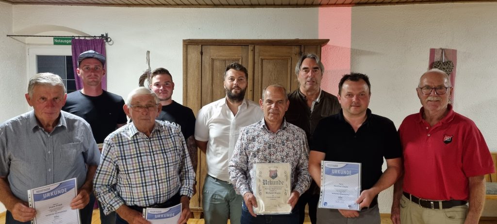 Uttenhofen (ind) Im Rahmen der Generalversammlung des Ball-Club Uttenhofen e.V. wurden von Kreis-Ehrenamtsbeauftragtem Norbert Thurner und BCU-Vorsitzenden Stefan Friedl zahlreiche verdiente Mitglieder geehrt. Thurner freute sich besonders, dass er bei seinem Heimatverein so viele und auch hochkarätige Auszeichnungen übergeben durfte. Die höchste verliehene Auszeichnung war die BLSV-Verdienstnadel in Gold mit großem Kranz für insgesamt 35jährige Funktionärstätigkeit, die an Ehrenvorstand Wolfgang Inderwies und Altvorstand Hans-Georg Reger ging. Nicht minder glanzvoll sind nach 30jähriger Funktionärstätigkeit die BLSV-Verdienstnadel in Gold mit Kranz und die BFV-Verbands-Ehrenmedaille in Silber für Gerhard Seitz, er erhielt zudem das BFV-Verbands-Ehrenzeichen in Gold für 40jährige Mitgliedschaft, welches ebenso an Eduard Berthold, Rupert Maier, Jakob Schaubeck, Hermann Schaubeck und Michael Thalmeier ging. Hermann Schaubeck bekam zudem die BLSV-Verdienstnadel in Silber mit Gold für 20jährige Funktionärstätigkeit. Mit der BFV-Verbands-Ehrenmedaille in Silber für 50jährige Mitgliedschaft wurden Georg Daschner, Horst Kaindl, Ernst Schattenhofer und Max Seemüller ausgezeichnet. Das BFV-Verbands-Ehrenzeichen in Silber für 30jährige Mitgliedschaft erhielten Gökhan Bozkartal, Ralf Hochmuth, Werner Mayer, Christian Mayerhofer und Robert Ziegler. Werner Mayer und Robert Ziegler bekamen zudem die BCU-Vereinsnadel in Bronze für 6jährige Funktionärstätigkeit. Christian Neumeir und Christoph Kaindl sind beide seit 25 Jahren BCU-Mitglied, sie erhielten die silberne Vereinsnadel. Schließlich wurde noch Dominik Essig für 10jährige Funktionärstätigkeit mit dem BFV-Verbands-Ehrenzeichen in Silber und der BLSV-Verdienstnadel in Bronze mit Kranz dekoriert.