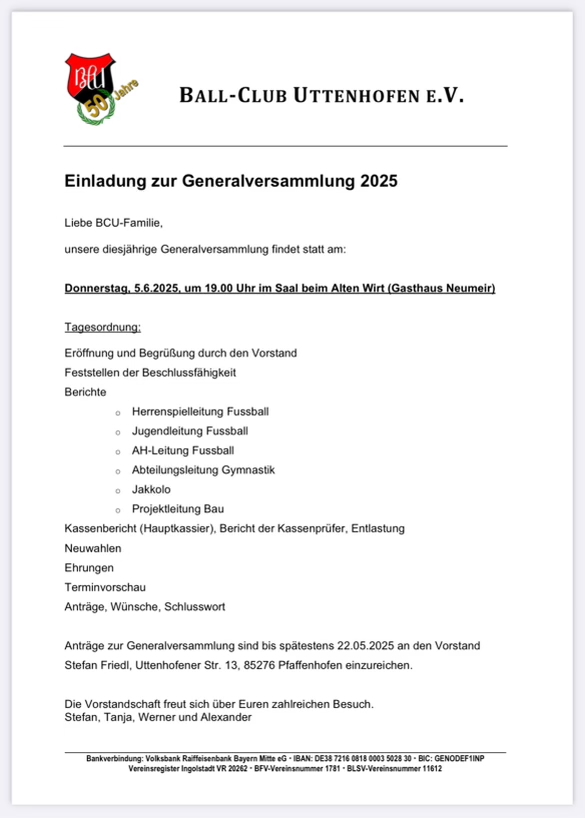 Harmonische Generalversammlung beim Ball-Club Uttenhofen e.V.